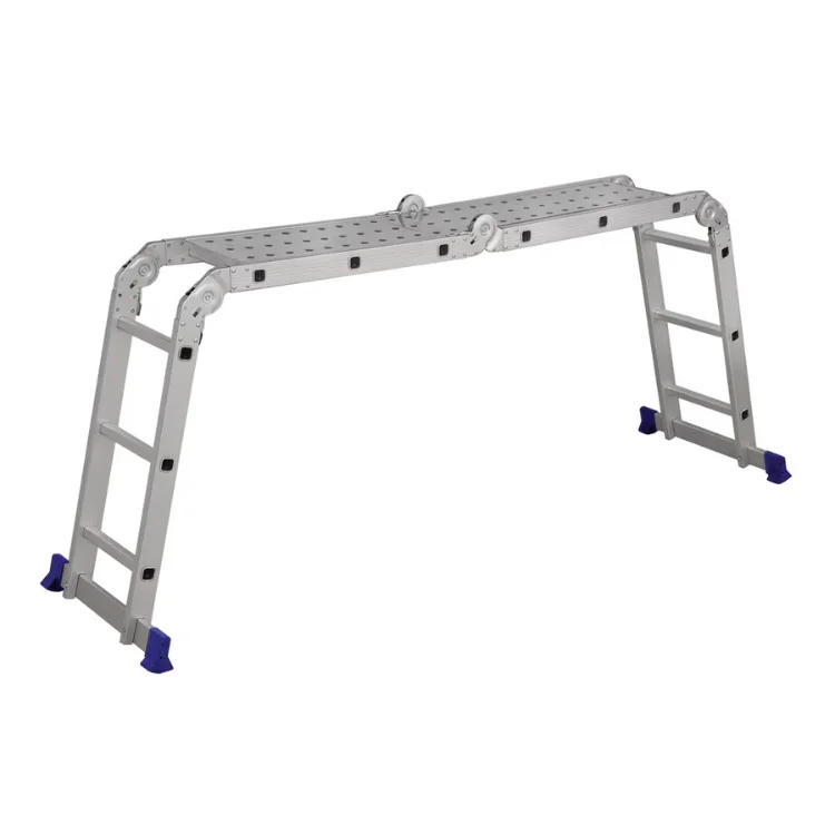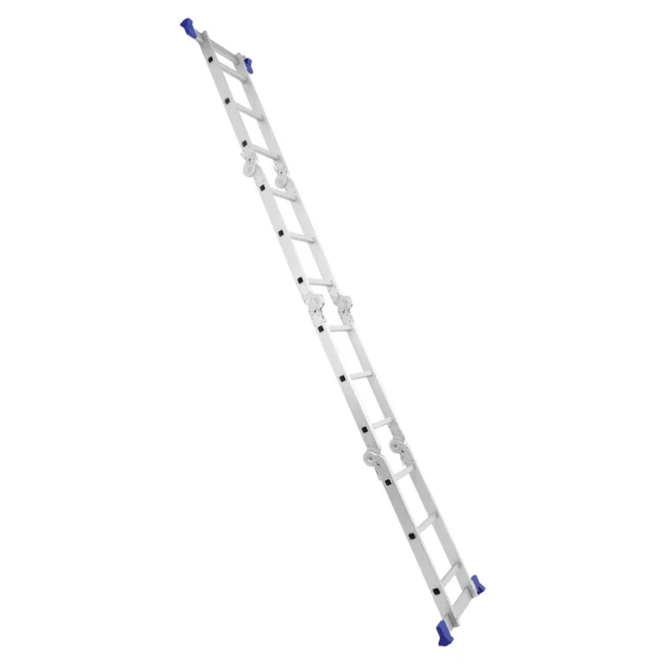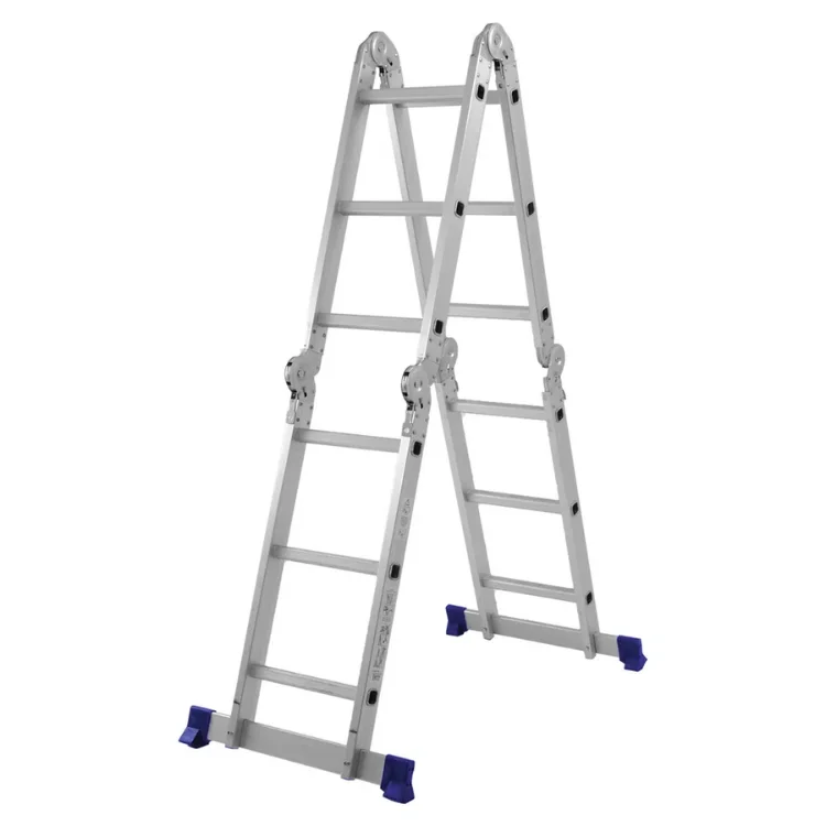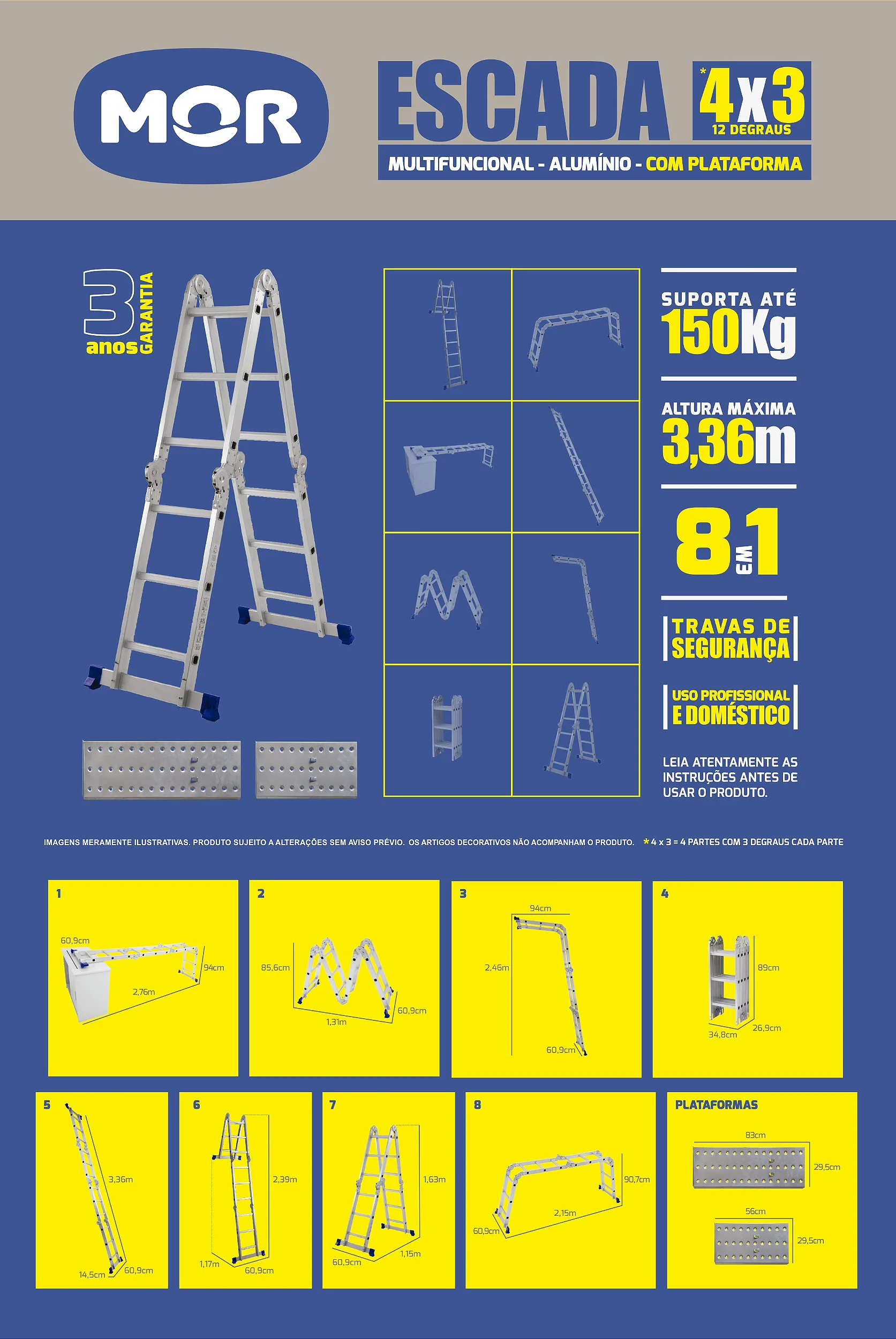A escada articulada 4×3 da Mor oferece 8 posições de uso, com catracas de travamento automático, degraus antiderrapantes e sapatas emborrachadas para máxima segurança. Estrutura em alumínio, leve e fácil de manusear. Conformidade EN-131. Capacidade: 150 kg.